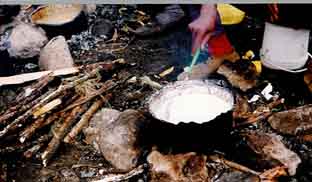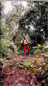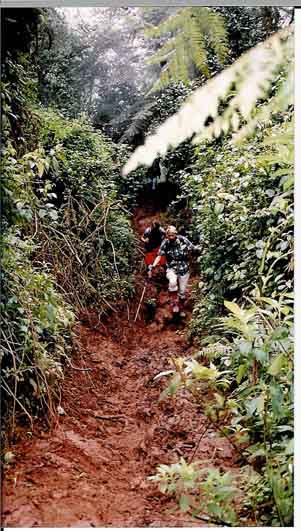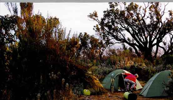 Das erste Camp nachmittags im Nebel, der Berg ist wegen der hohen Luftfeuchtigkeit nicht zu sehen. |